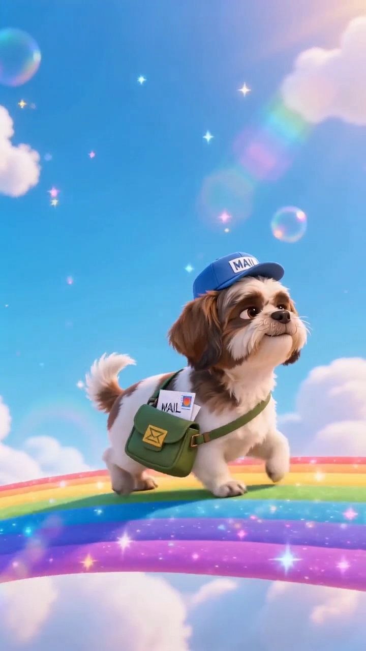 Look at the cover image of this article: DaoDao is wearing a little blue "MAIL" cap and carrying a green messenger bag, stepping lightly across a brilliant rainbow. It's not just a cute picture; it feels like a letter sent directly from the "Rainbow Bridge," letting me know he's doing wonderfully and still delivering joy.